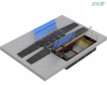 The dirt trap system has a Scraper conveyor which scrapes the dirt out of the bottom of the tank. The chute carries the sludge out and dumps it at the ground level. A loader can be used to remove the sludge from the ground level.