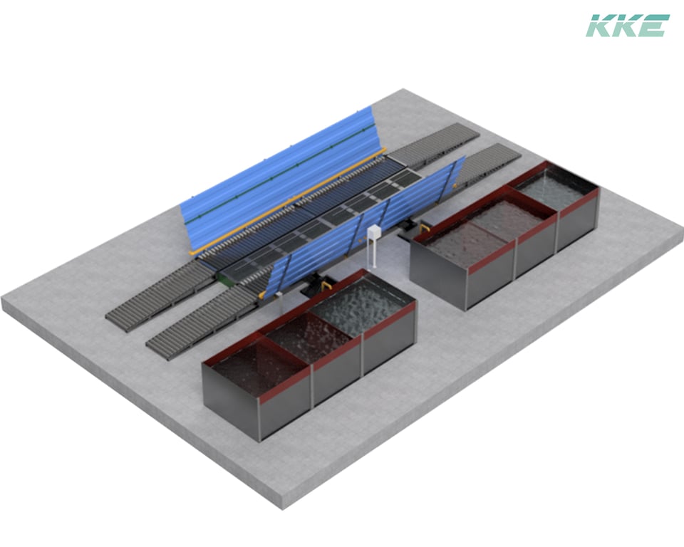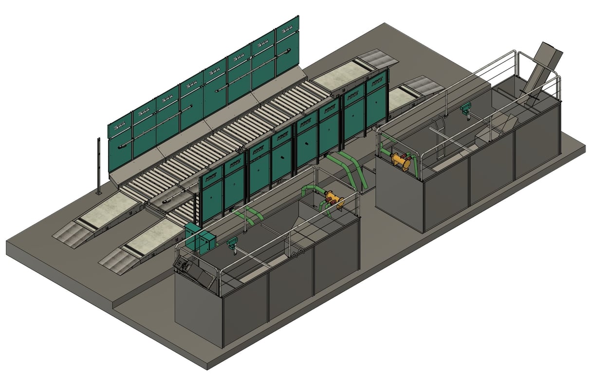 TW610 40.8 AG Tire Wash System Configuration Consists of 8 m wash Bay with Entry and Exit Ramps. The System has the settling tanks above ground and hence requires minimal civil construction or excavation.